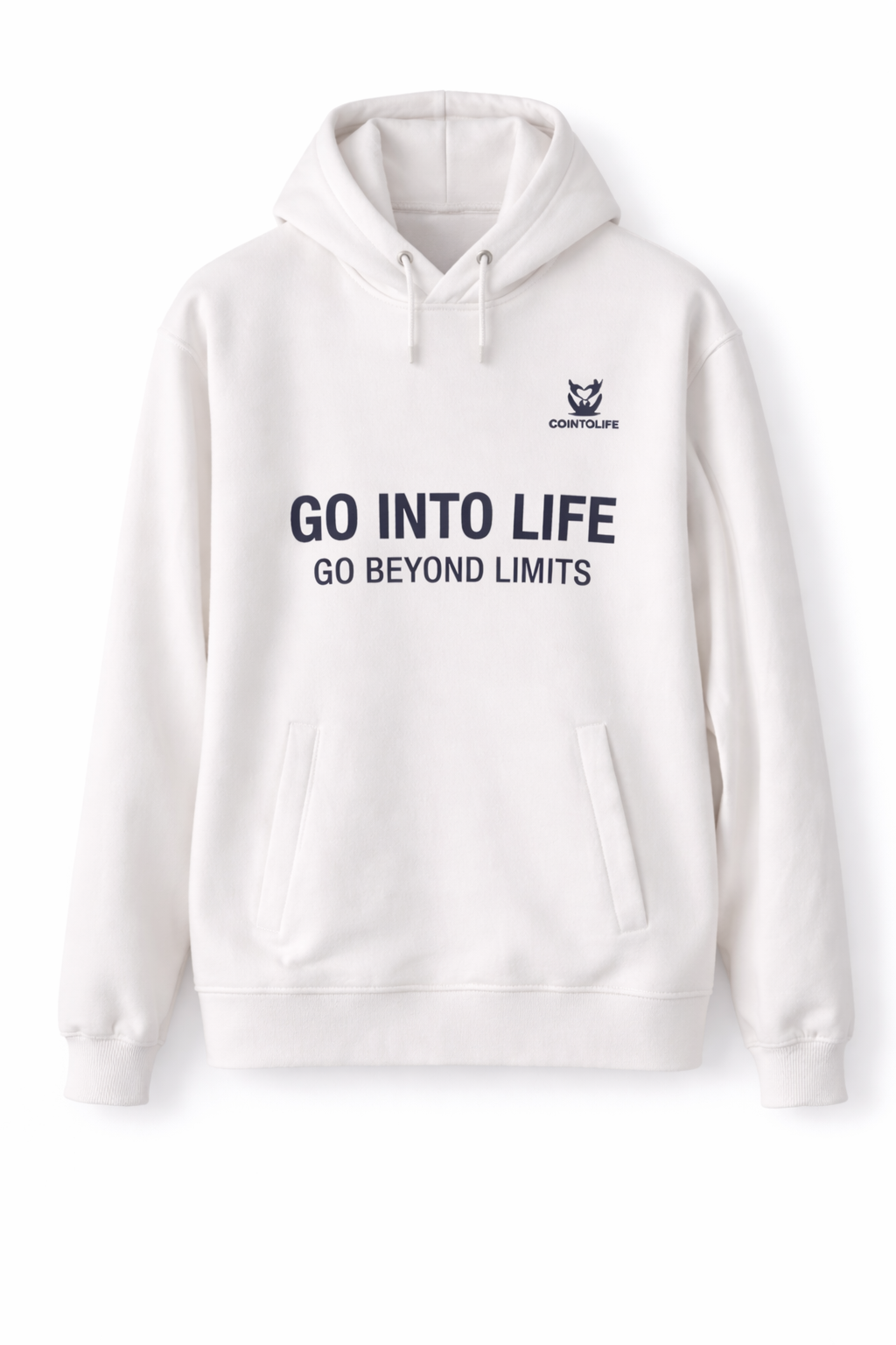 Hoodie GO INTO LIFE unisexe blanc, confortable et stylé, avec message inspirant. Idéal pour le sport, la récupération et le quotidien.