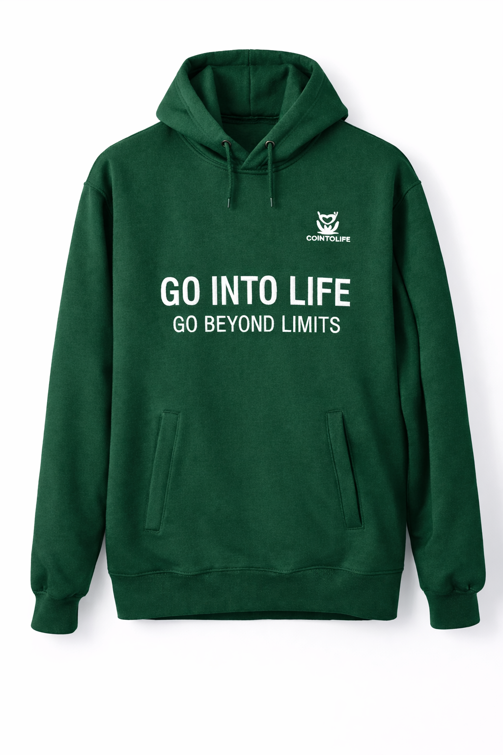 Hoodie GO INTO LIFE unisexe vert, confortable et stylé, avec message inspirant. Idéal pour le sport, la récupération et le quotidien.