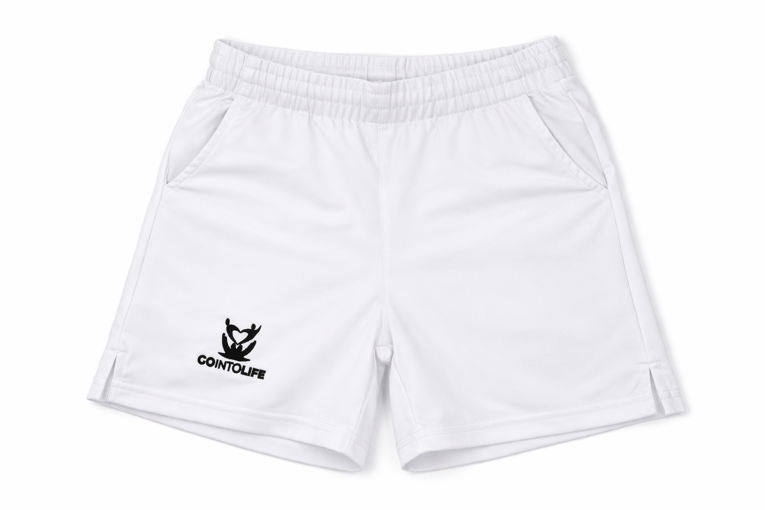 Short GO INTO LIFE FLEX femme / enfant Blanc – tissu technique résistant, respirant, coupe ergonomique, ceinture élastiquée à cordon. Tailles 12 ans au 3XL