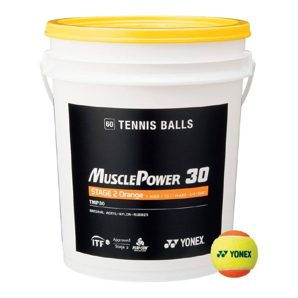 Baril de 60 balles YONEX TMP-30 Orange (Stage 2), 50 % plus lentes que des balles standard ITF. Recommandées avec raquettes 23-25 pouces, idéal initiation et clubs.
