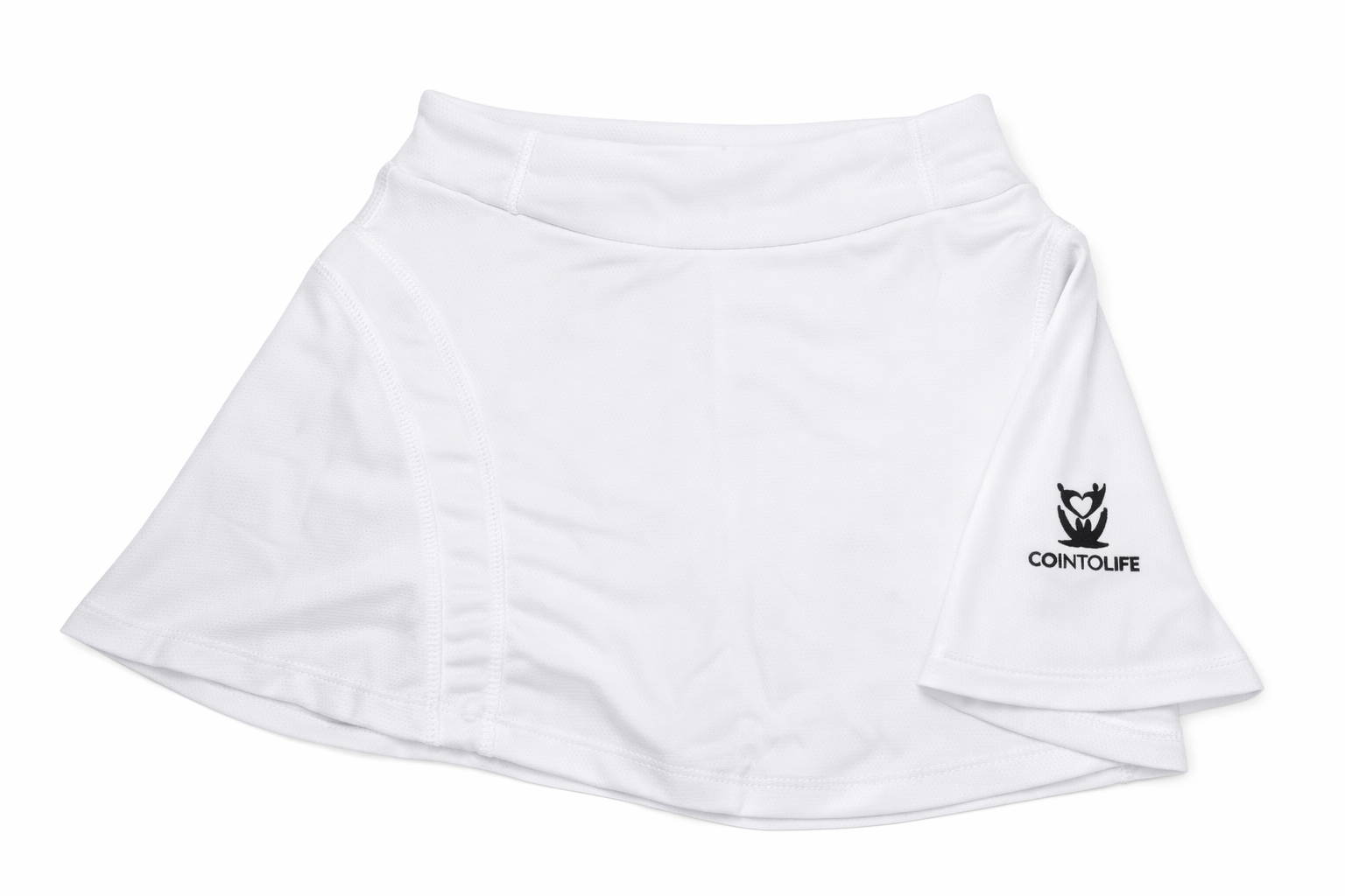 Jupe GO INTO LIFE AURA Blanche – tissu stretch respirant, shorty intégré, ceinture large. Légère, sèche vite et suit tous les mouvements. Tailles 12 ans à 3XL.