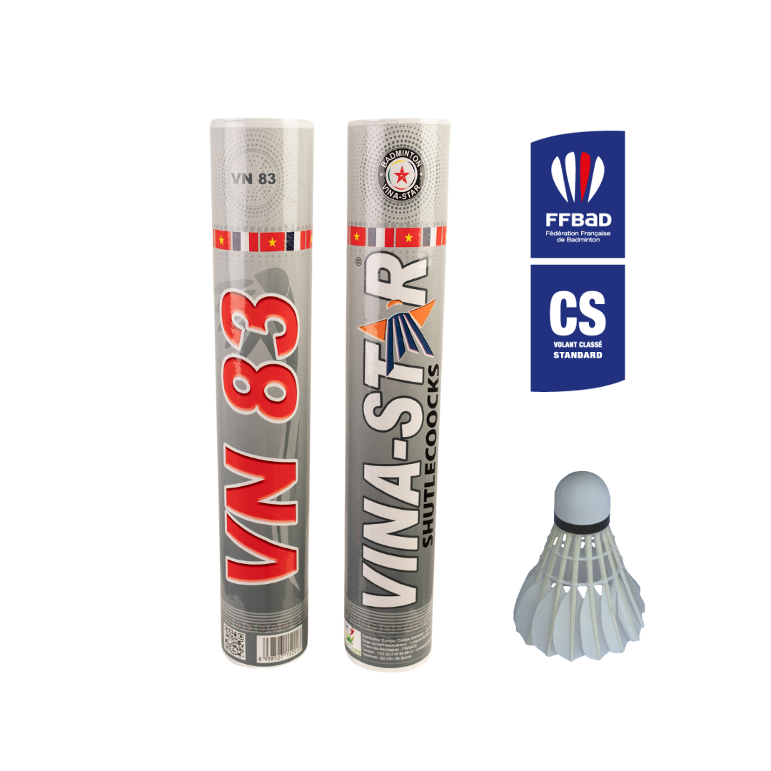 Volants de badminton VINA-STAR VN 83 en plumes d'oie, offrant une trajectoire stable et une bonne durabilité. Idéals pour les entraînements et compétitions, ils assurent performance et fiabilité à chaque échange.